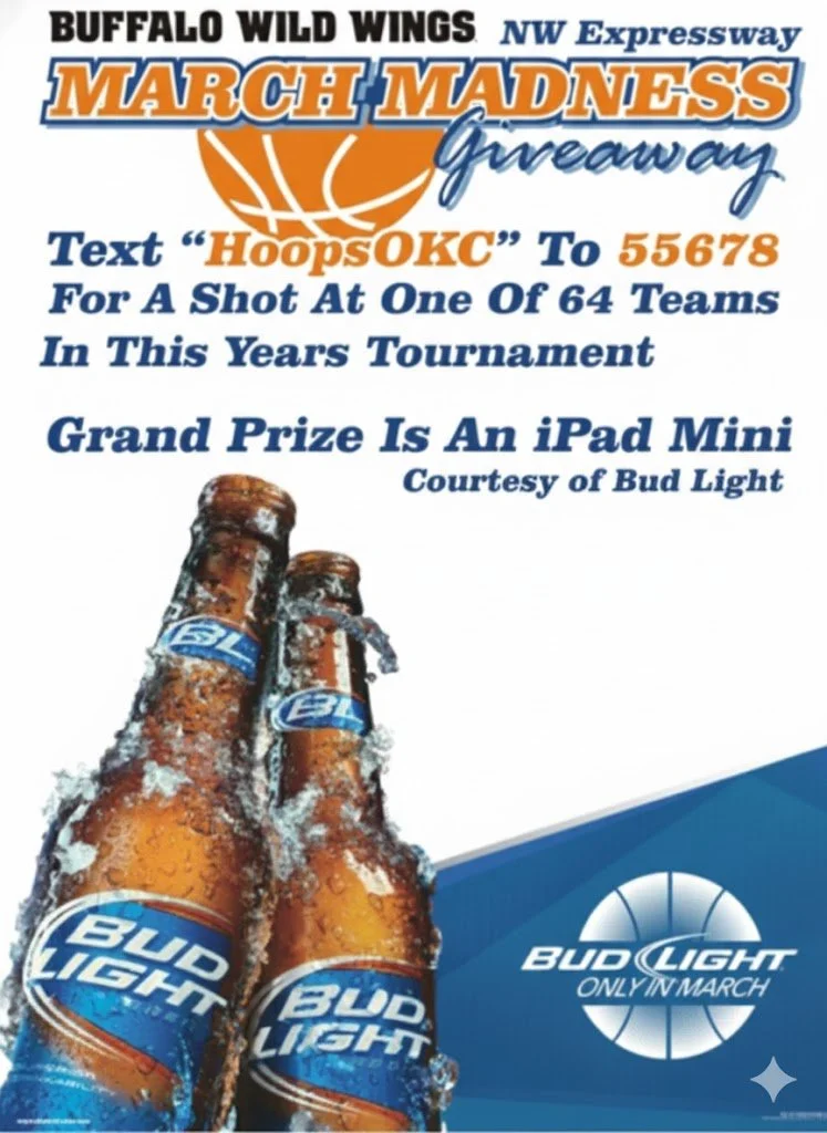 Buffalo Wild Wings used many outlets to promote the March Madness giveaway however, it all circled back to joining the mobile club. Text “HOOPSOKC” to 55678 for a shot at one of 64 teams in this years tournament. A kiosk was setup in the restaurant allowing patrons to register, in-store signage was posted and posts on Facebook gave full details of the promotion. Winners were announced on the Buffalo Wild Wings Facebook wall.